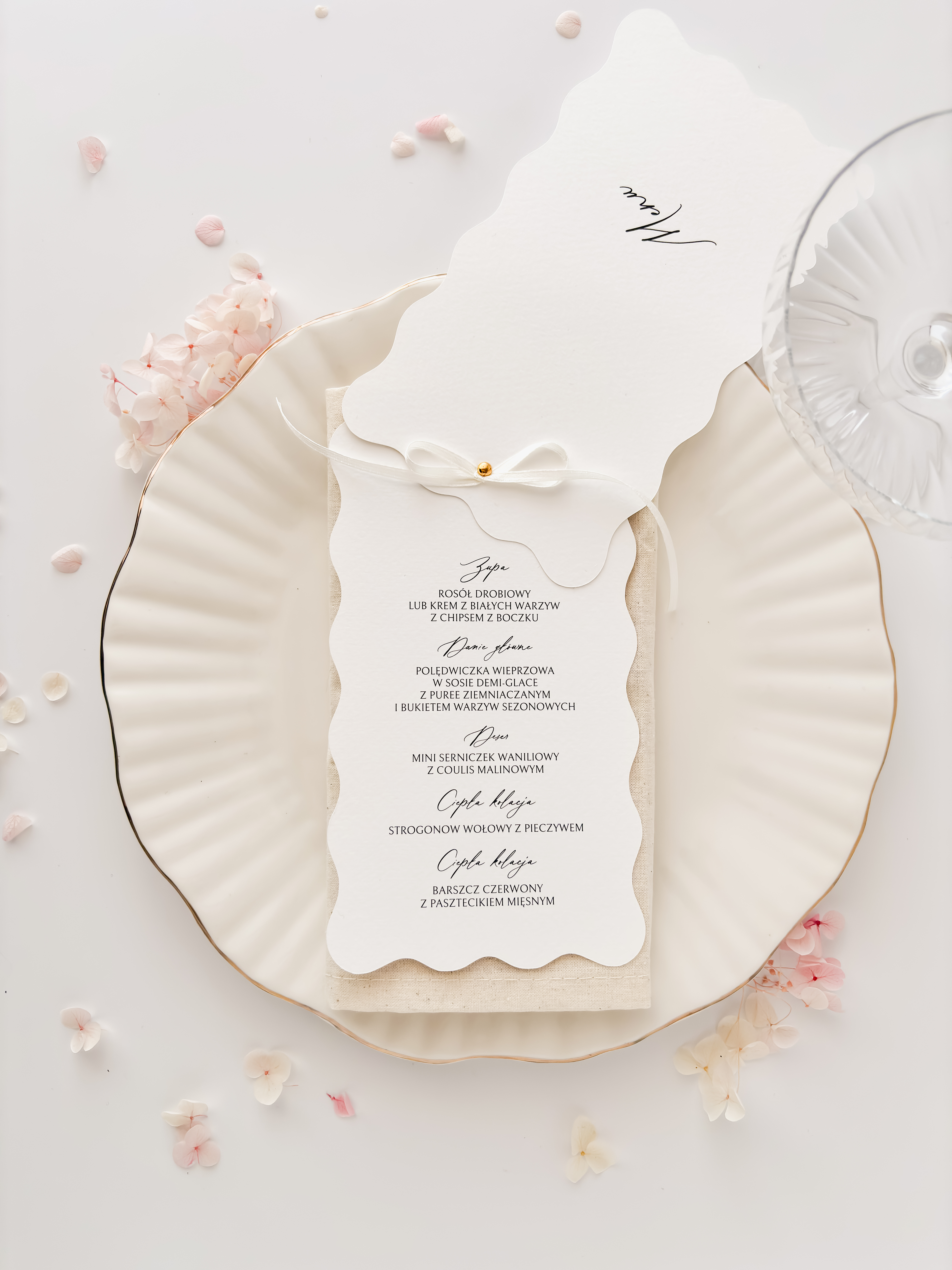 Menu w kształcie fali o wymiarach 10,4 x 18,1 cm, drukowane na białym papierze fakturowanym o gramaturze 250g.