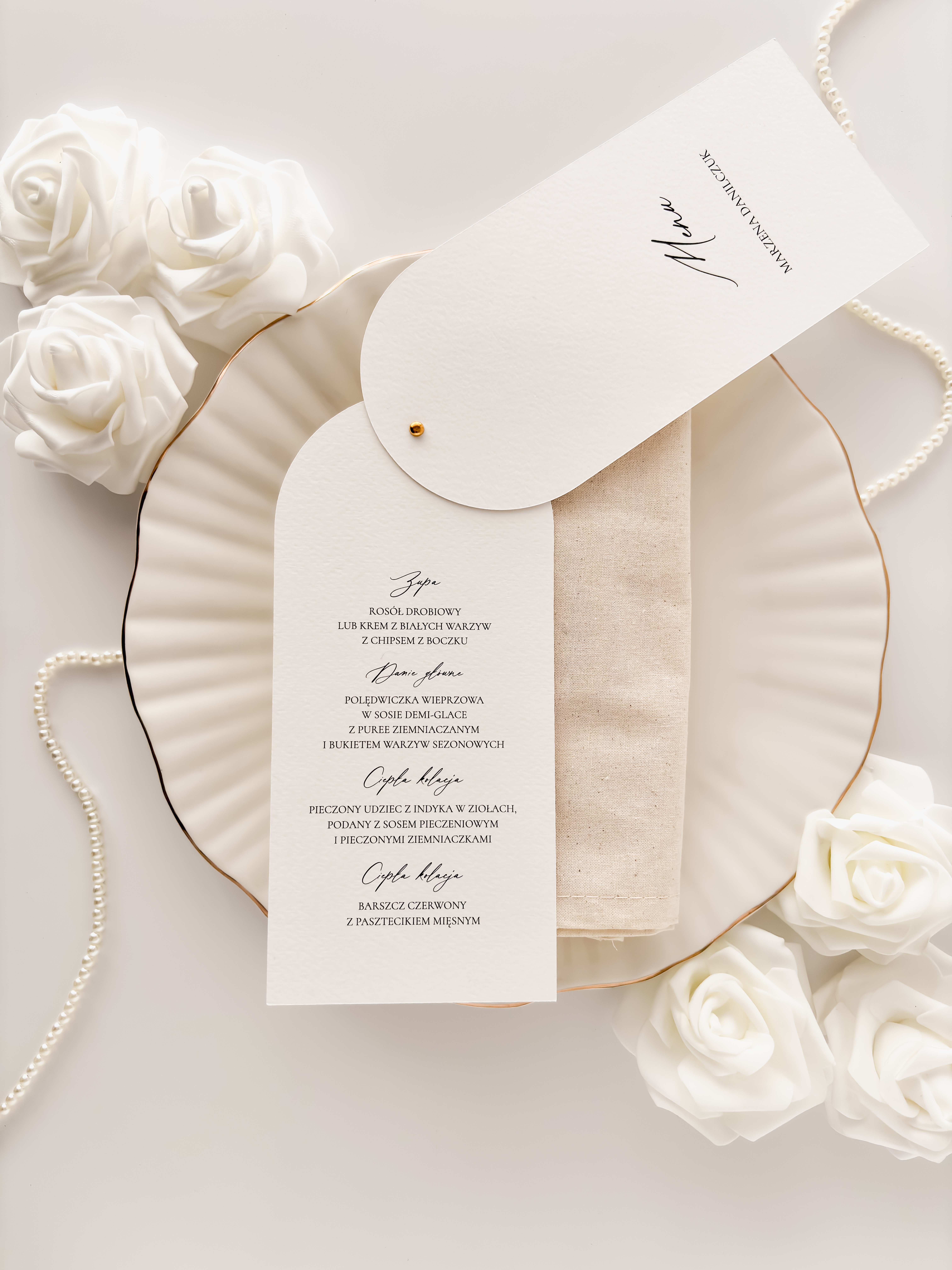 Menu leżące z winietką o wymiarach 9,2 x 20 cm, drukowane na białym papierze fakturowanym o gramaturze 250g.