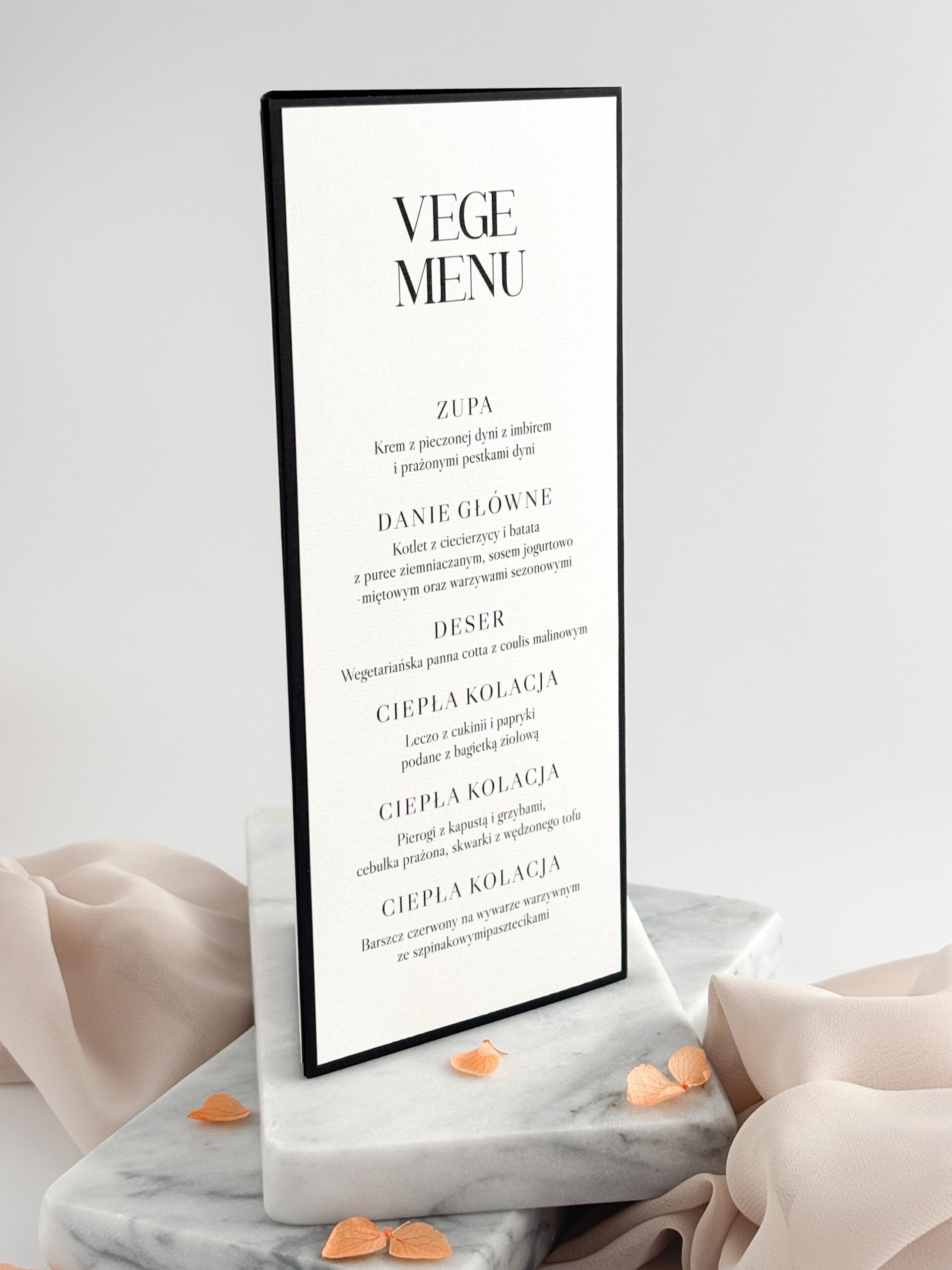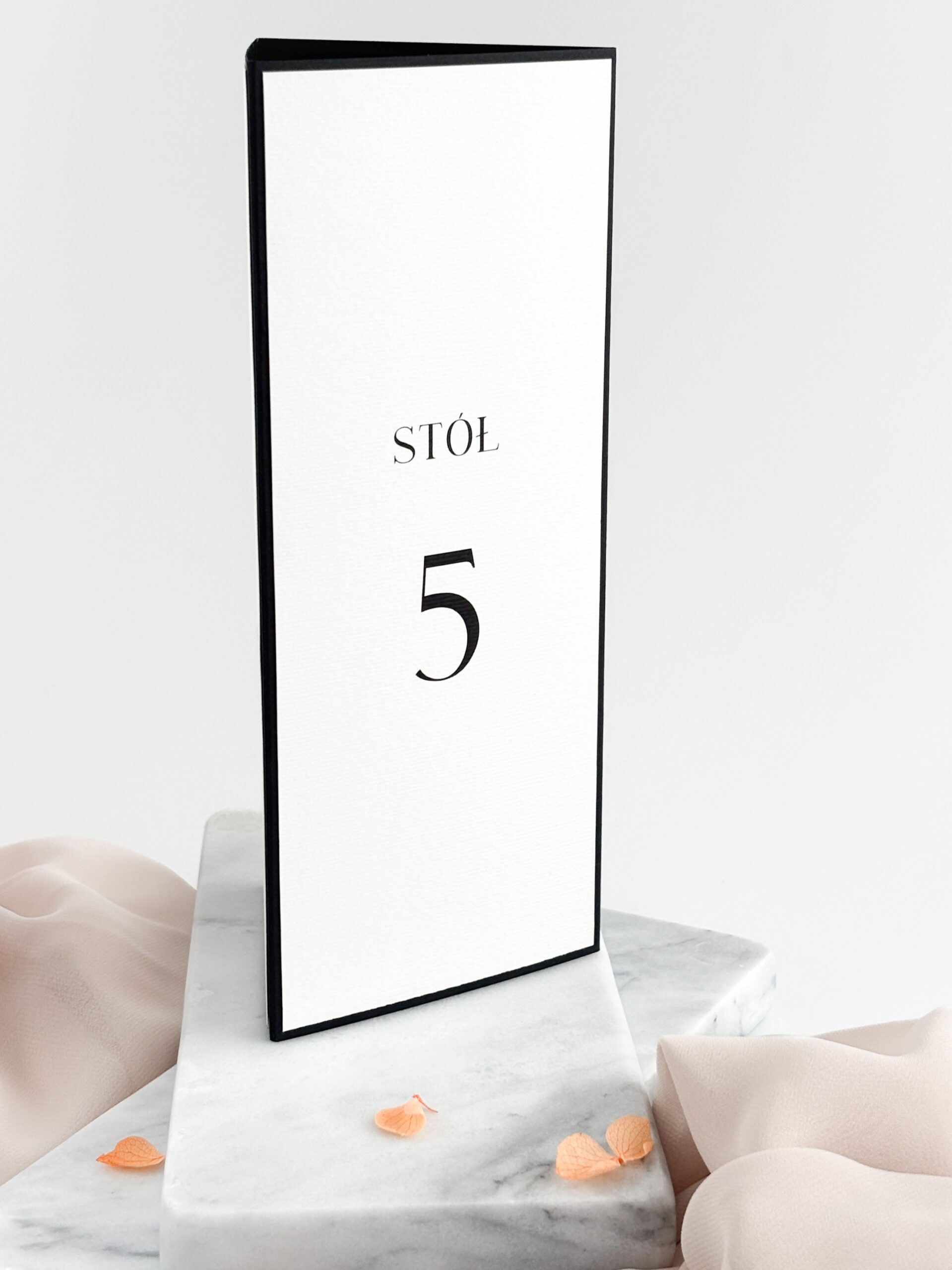 Menu weselne trójkątne składające się z czarnego papieru 250g/m2 połączonego z białym, fakturowanym papierem 240g/m2. Wymiary po złożeniu: 9 x 21 cm.