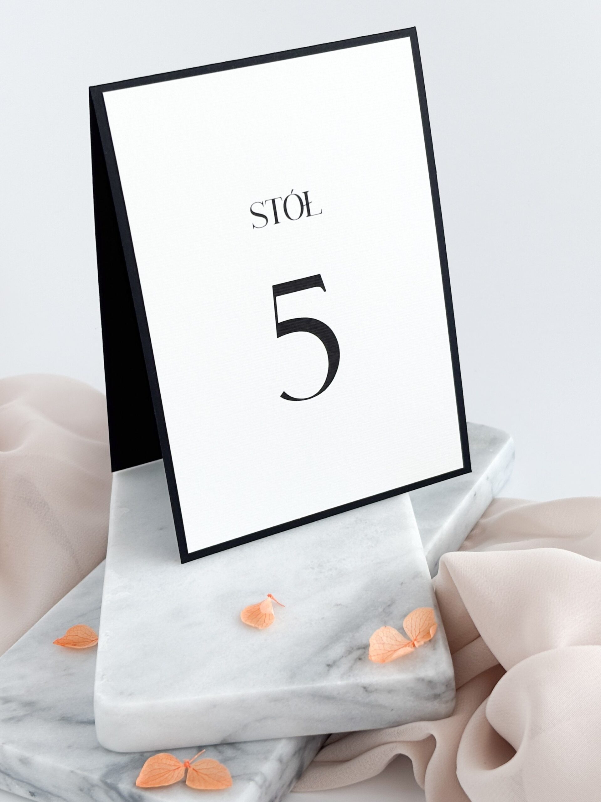 Czarno-biały numer stołu w wymiarach 10,5 x 21 cm, składający się z czarnego papieru 250g/m2 połączonego z białym, fakturowanym papierem 240g/m2.Wymiary po złożeniu ok. 10,5 x 14,8 cm