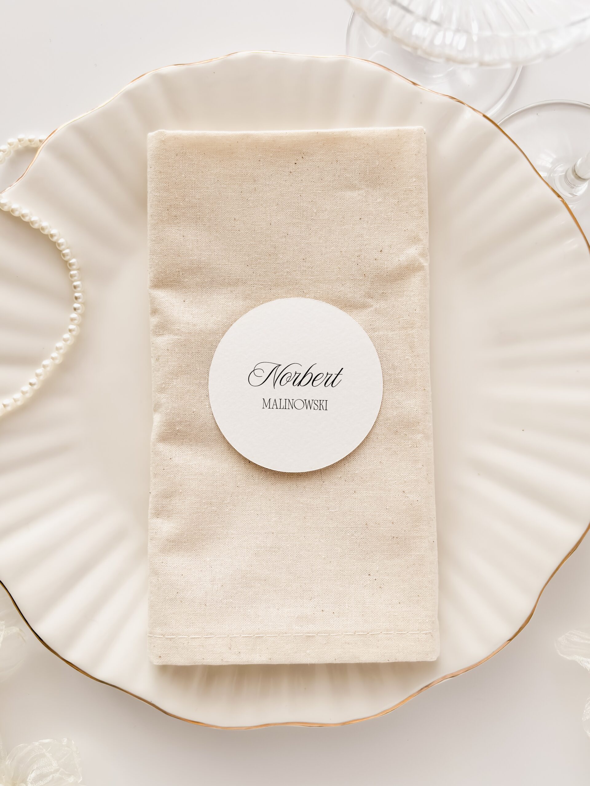 Okrągła winietka leżąca o średnicy 7 cm, drukowana na białym papierze fakturowanym o gramaturze 250g.