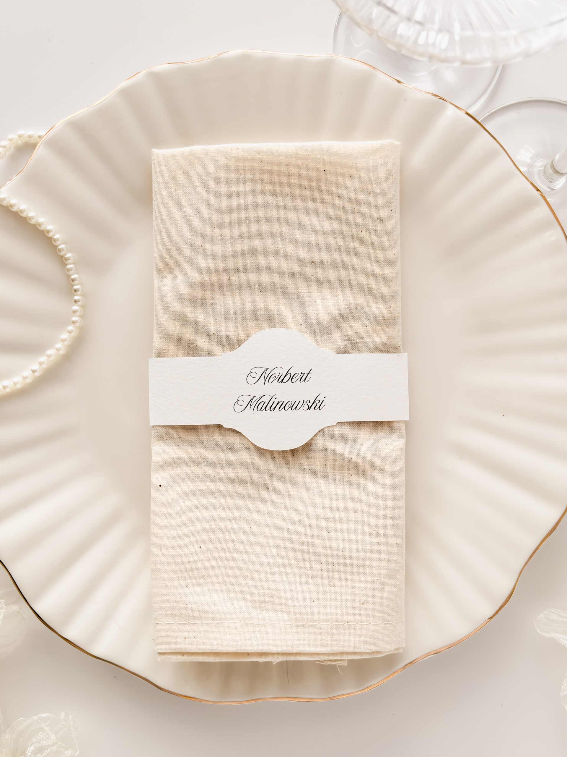 Winietka – obrączka na serwetkę o wymiarach 10,5 x 5 cm drukowana na białym papierze fakturowanym o gramaturze 250g.