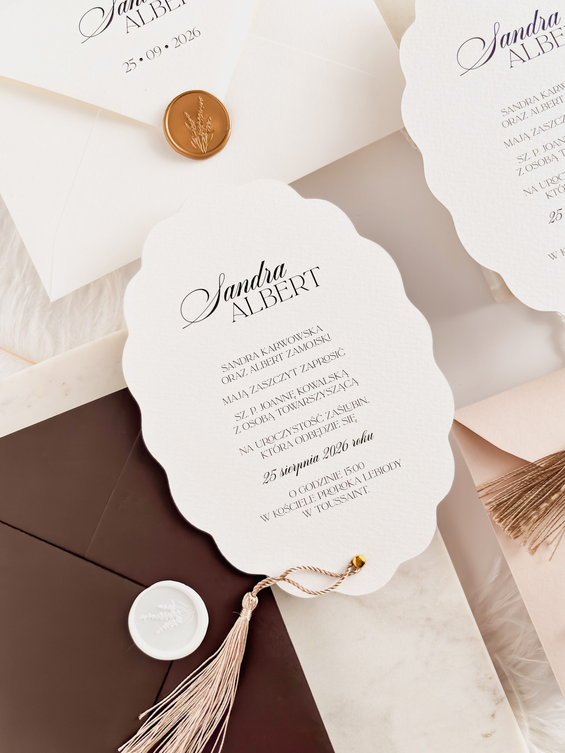 Zaproszenie ślubne z chwostem o wymiarach około 11,5 x 16,5 cm, drukowane na papierze fakturowanym 250g/m2 w kolorze ecru.