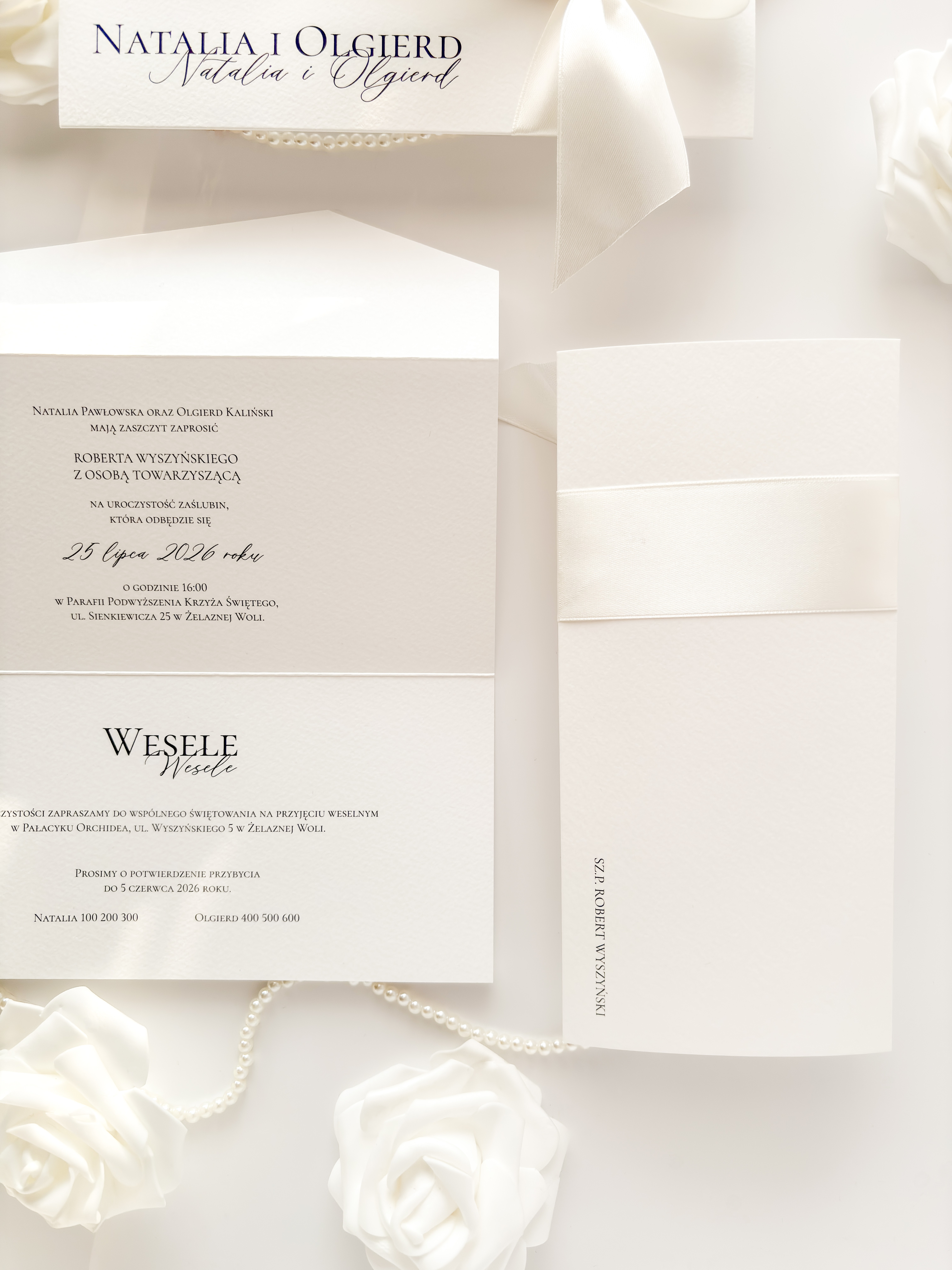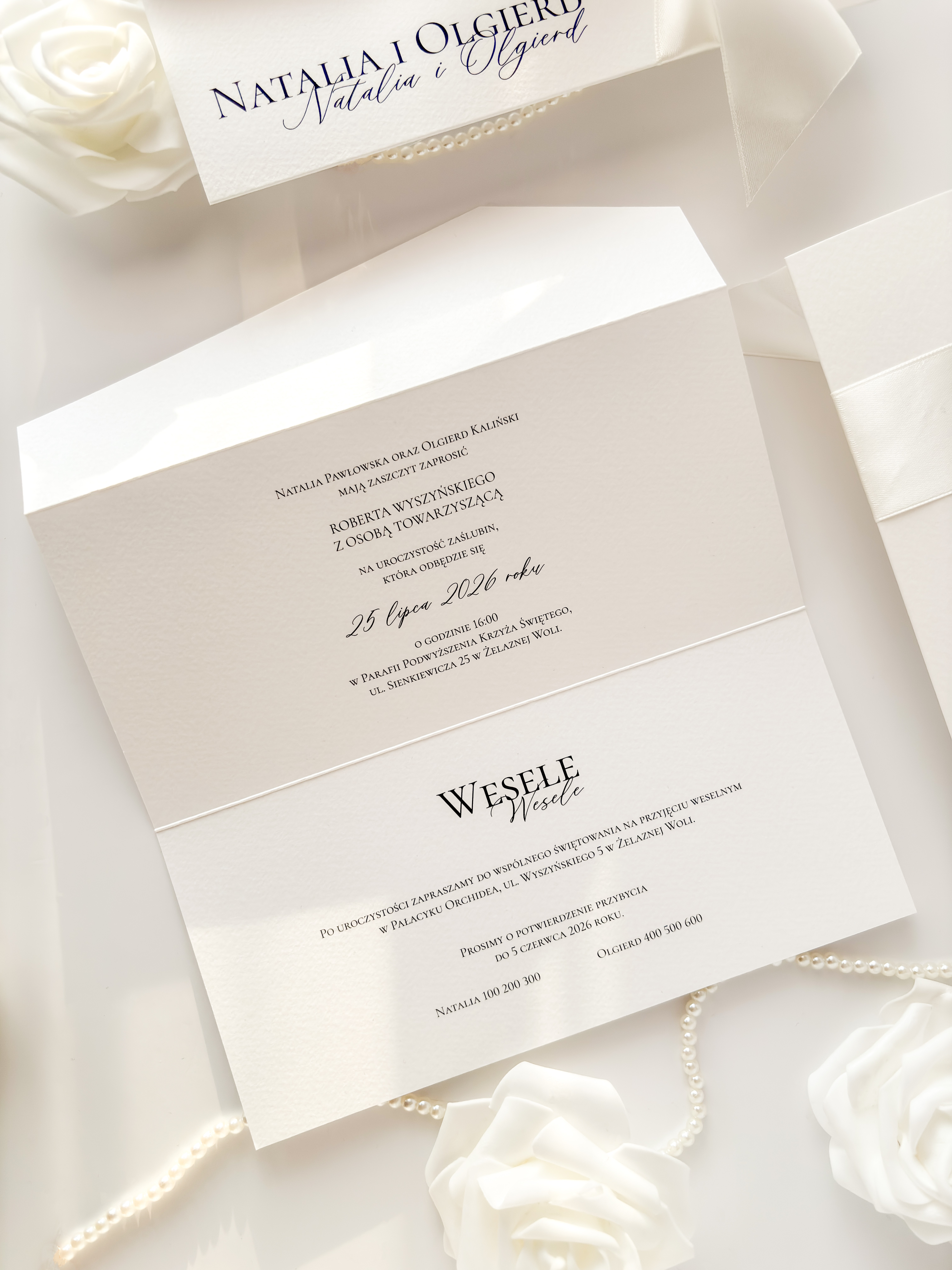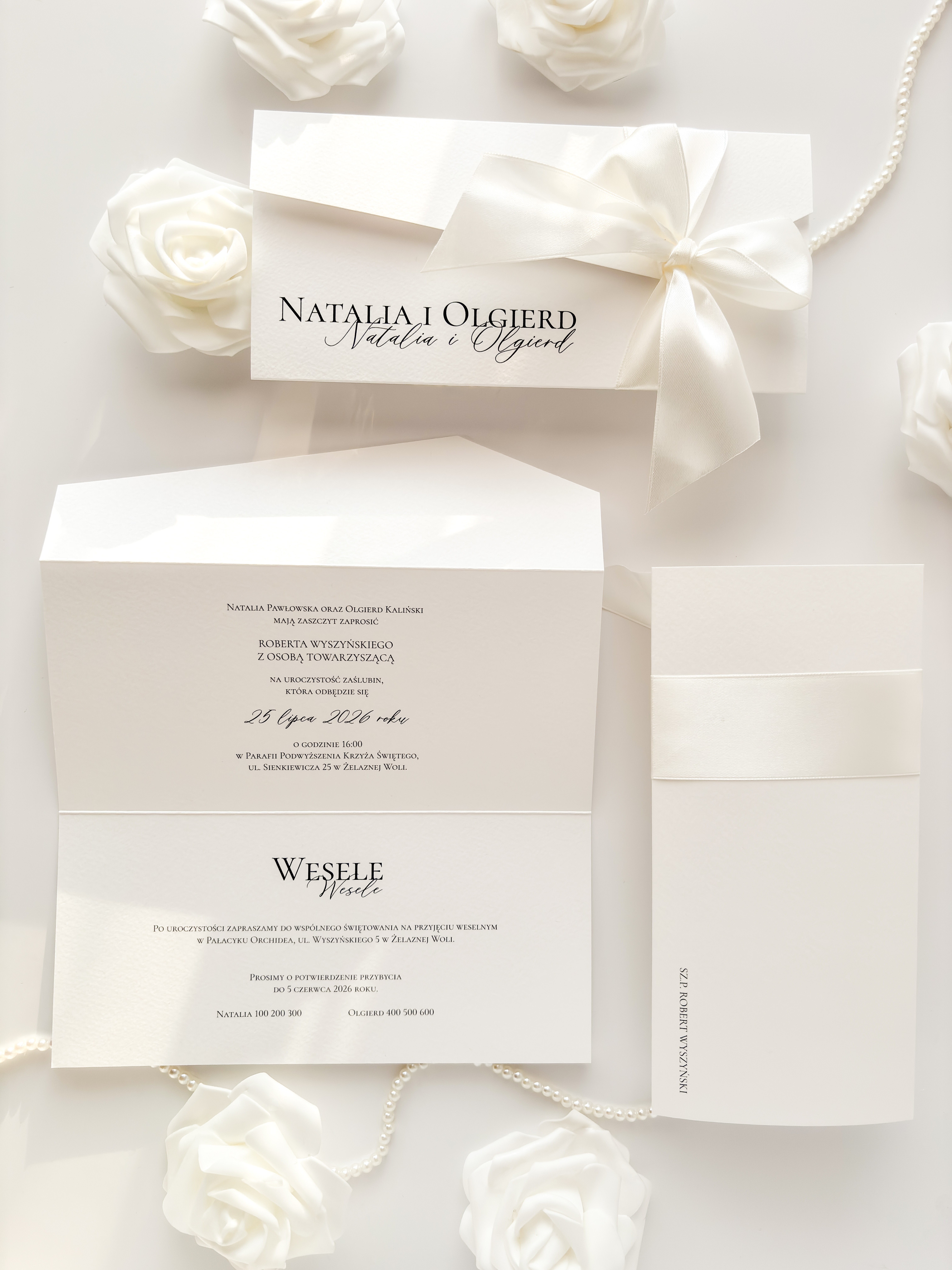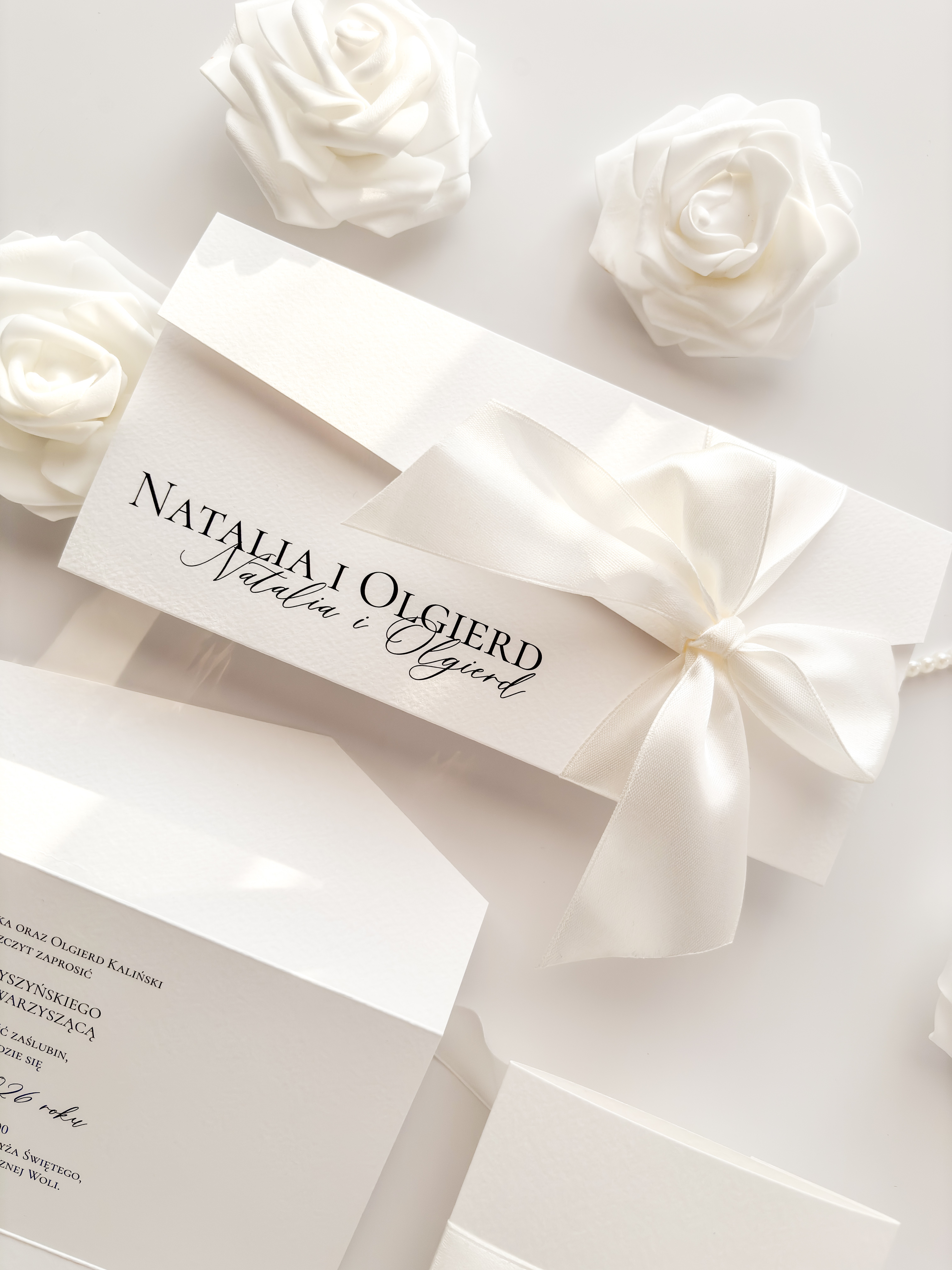 Składane zaproszenie ślubne z kokardą w kolorze białym. Wymiary zaproszenia po złożeniu: 21 x 10 cm.