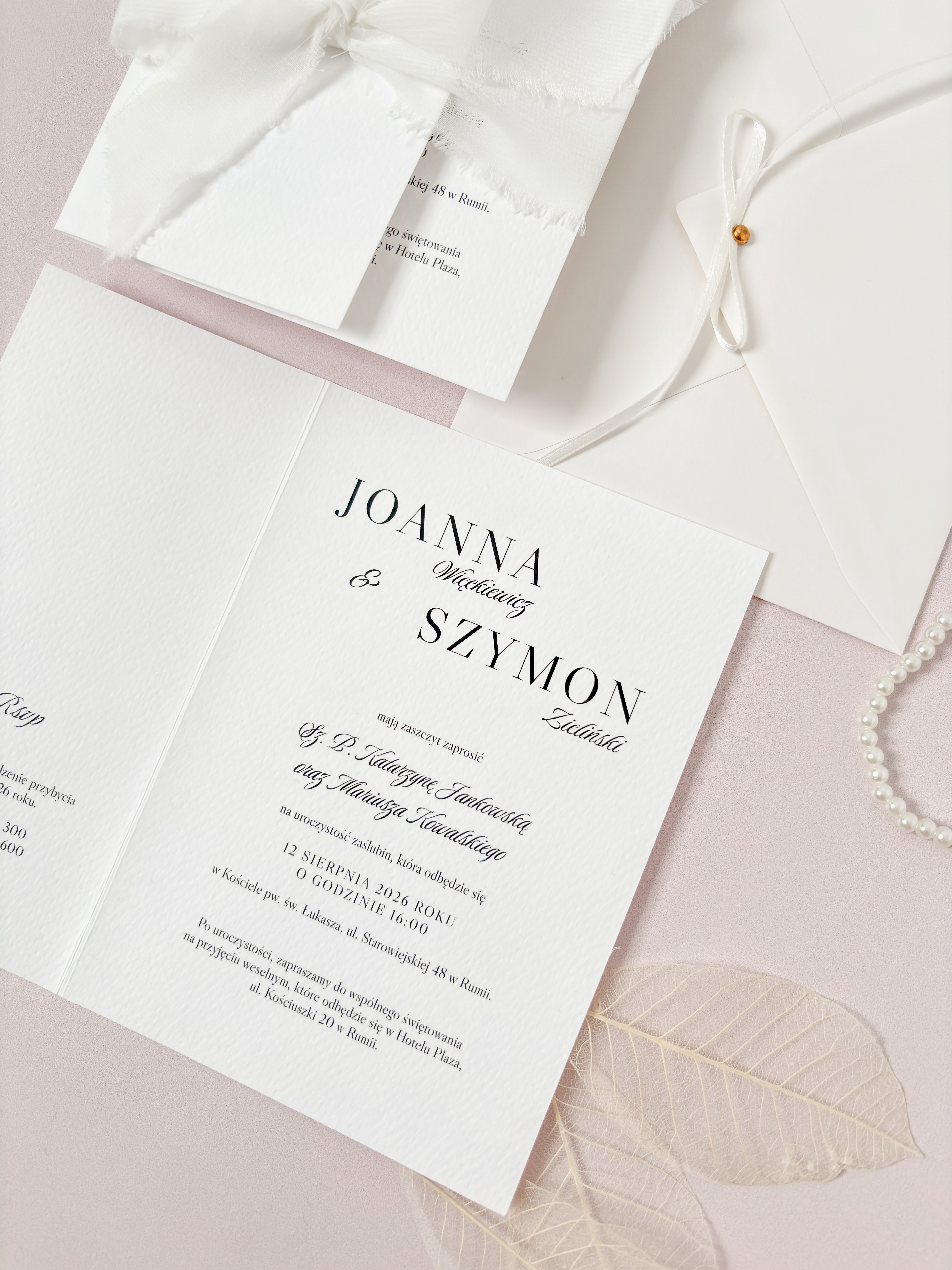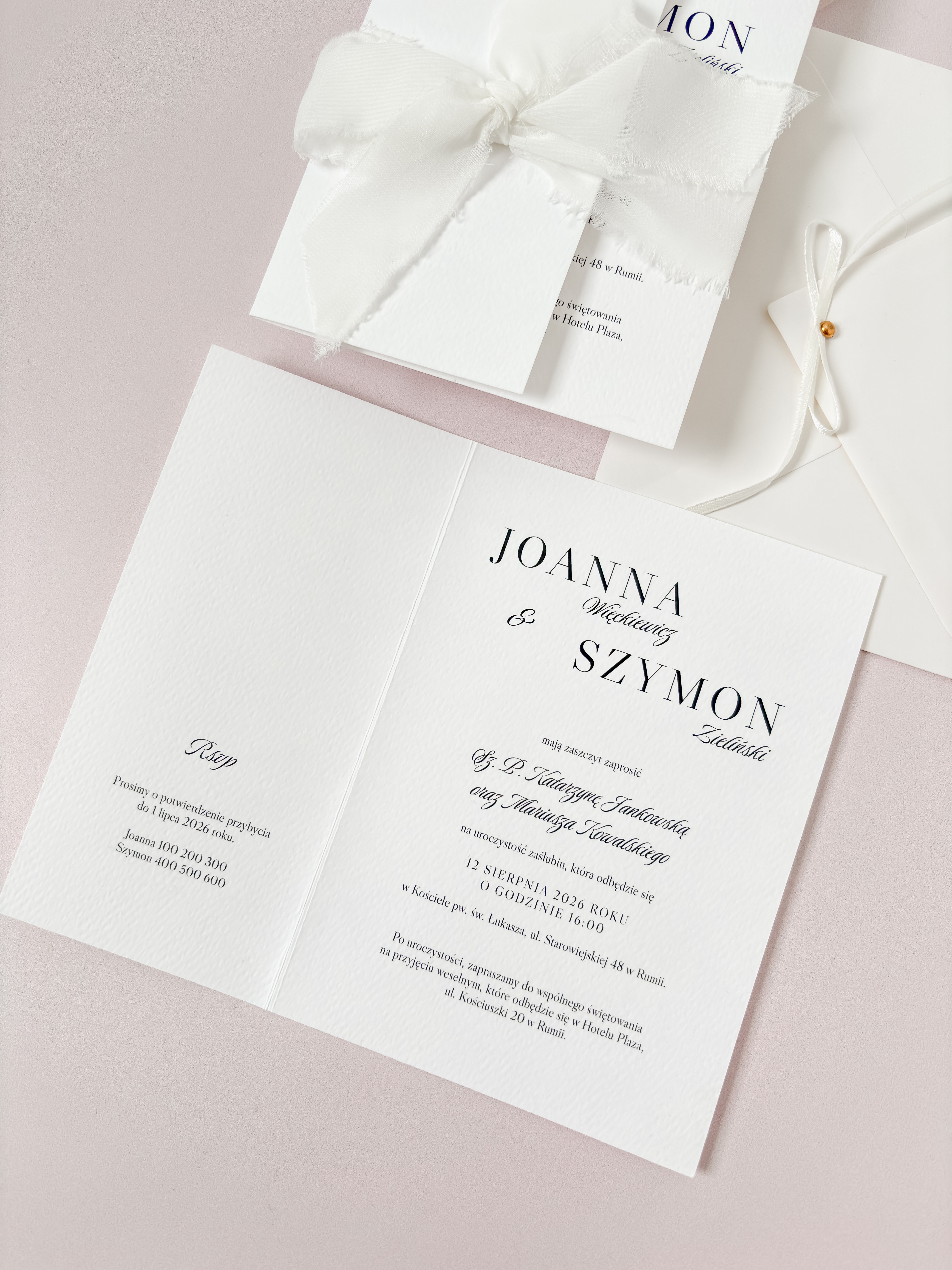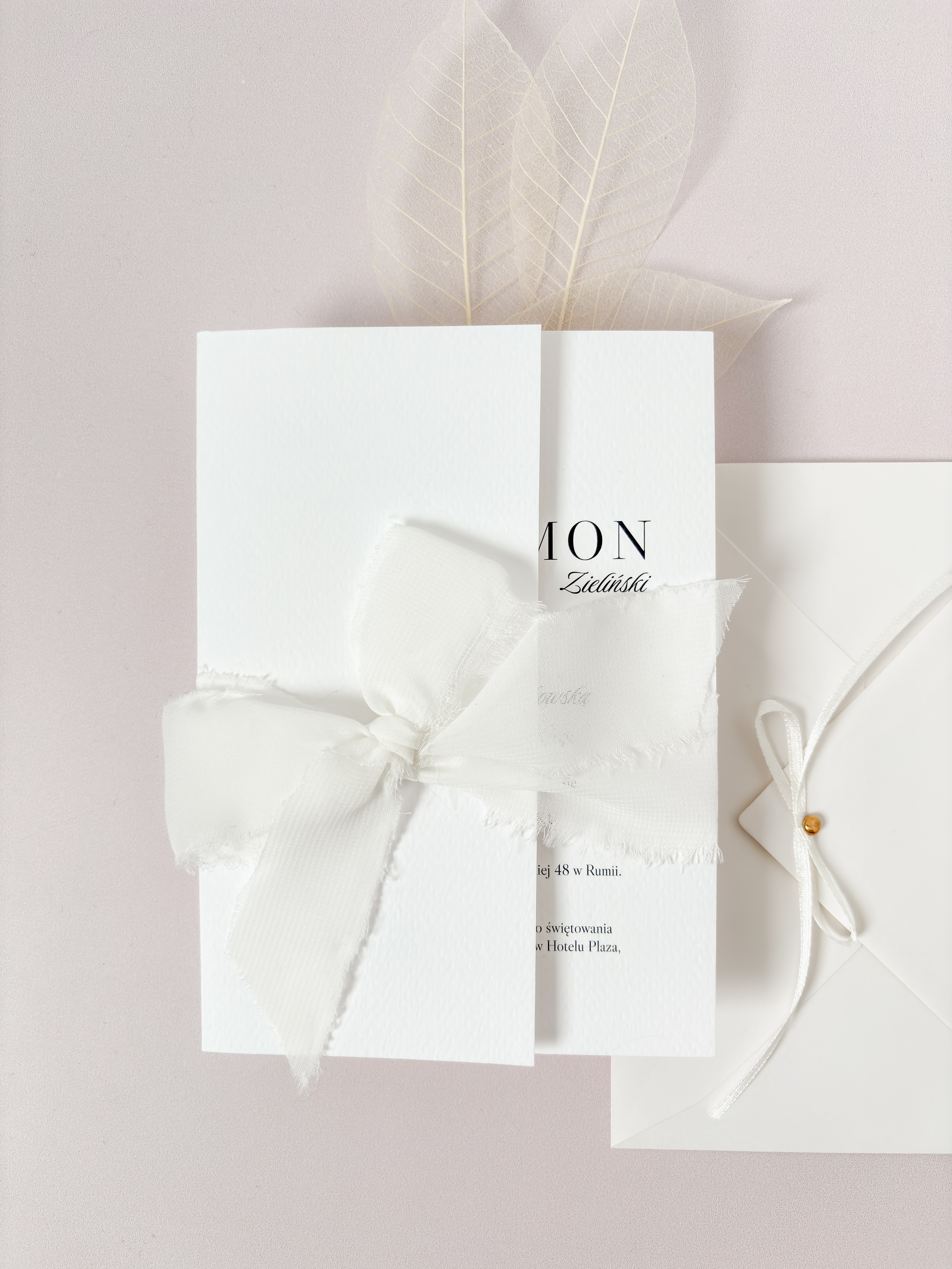 Zaproszenie ślubne z wstążką szyfonową o wymiarach 12 x 17 cm po złożeniu, drukowane na papierze fakturowanym o gramaturze 250g.