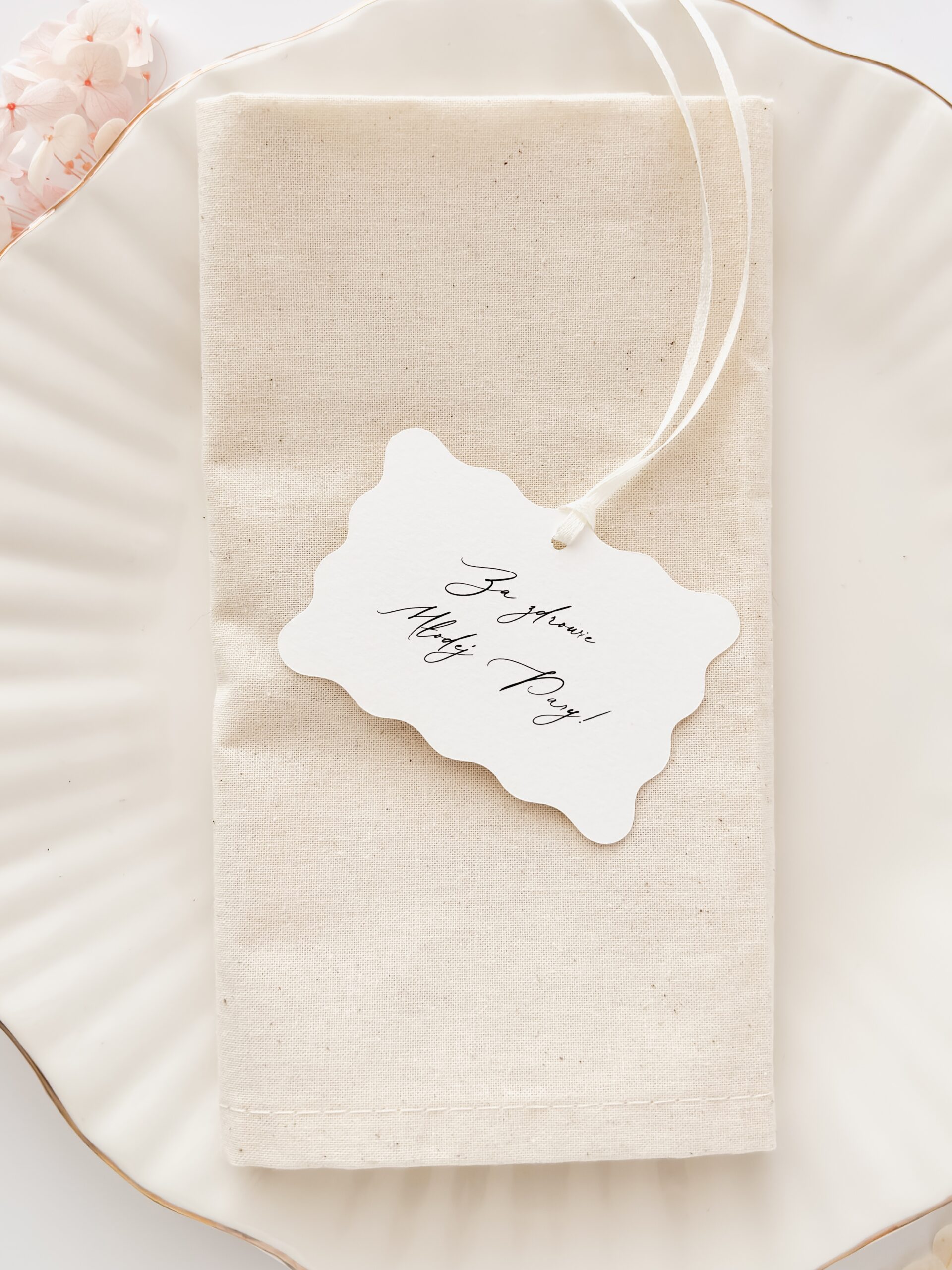Zawieszki weselne o wymiarach 8 x 5,5 cm.. Można zawiesić je na butelce, kieliszku lub dołączyć w formie bileciku do podziękowań dla gości.